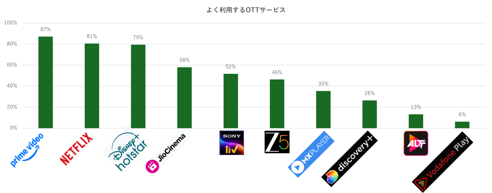 自主調査の結果からインドにおける「よく利用するOTTサービス」のランキングは、以下の結果となった。Netflixのような日本でも馴染みのあるグローバルOTTサービスも、スマホの普及などもありインドでも浸透している。