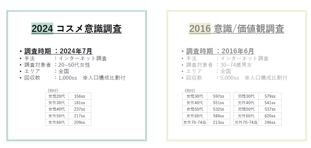 初めに、大人女子の価値観とその変化を探るべく、コスメ意識調査を実施し、さらに2016年6月実施済の同様の意識調査の調査結果を比較しました。
