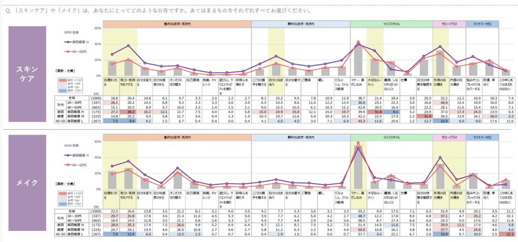 メイクやスキンケアに対してもポジティブで、「自信をくれる」「気分・気持ちをアゲる」ものと考える人が多い点も見えました。