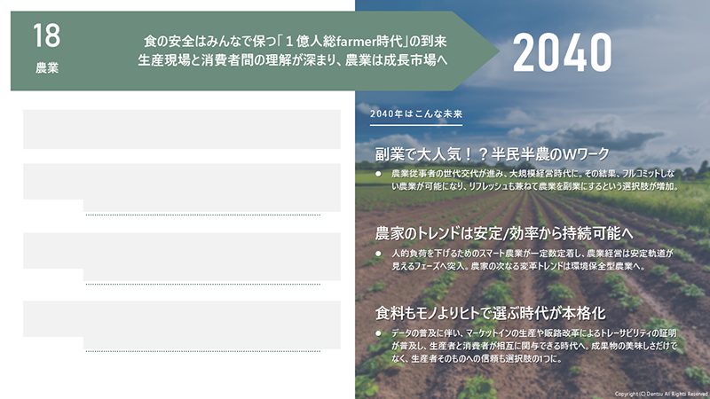 さらに、一部テーマの統合や名称変更を行った上で、気候変動を含む複数の要因によるコメや野菜の価格高騰などを背景に、世の中の関心が高まっている「農業」をはじめとして、未来のビジネスを考える際に重要と捉えた5テーマ(「農業」「つながり」「推し活」「資産」「情報流通」)を新たに追加しています。